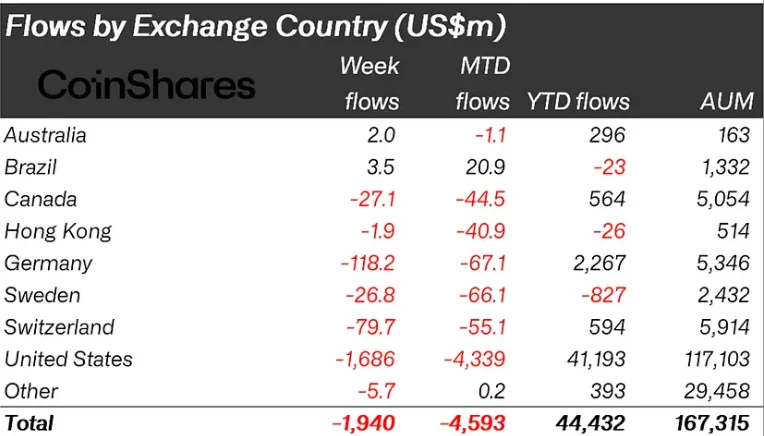 Инвесторы из Бразилии и Австралии вложили $3,5 млн и $2 млн соответственно. Основная доля оттока пришлась на США — $1,68 млрд.